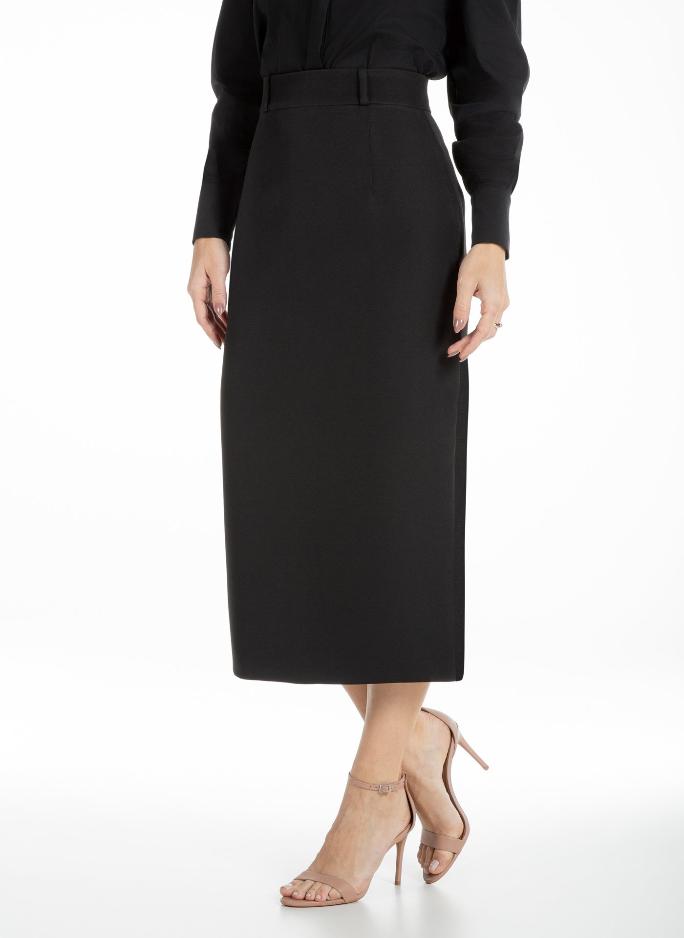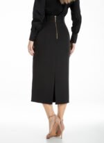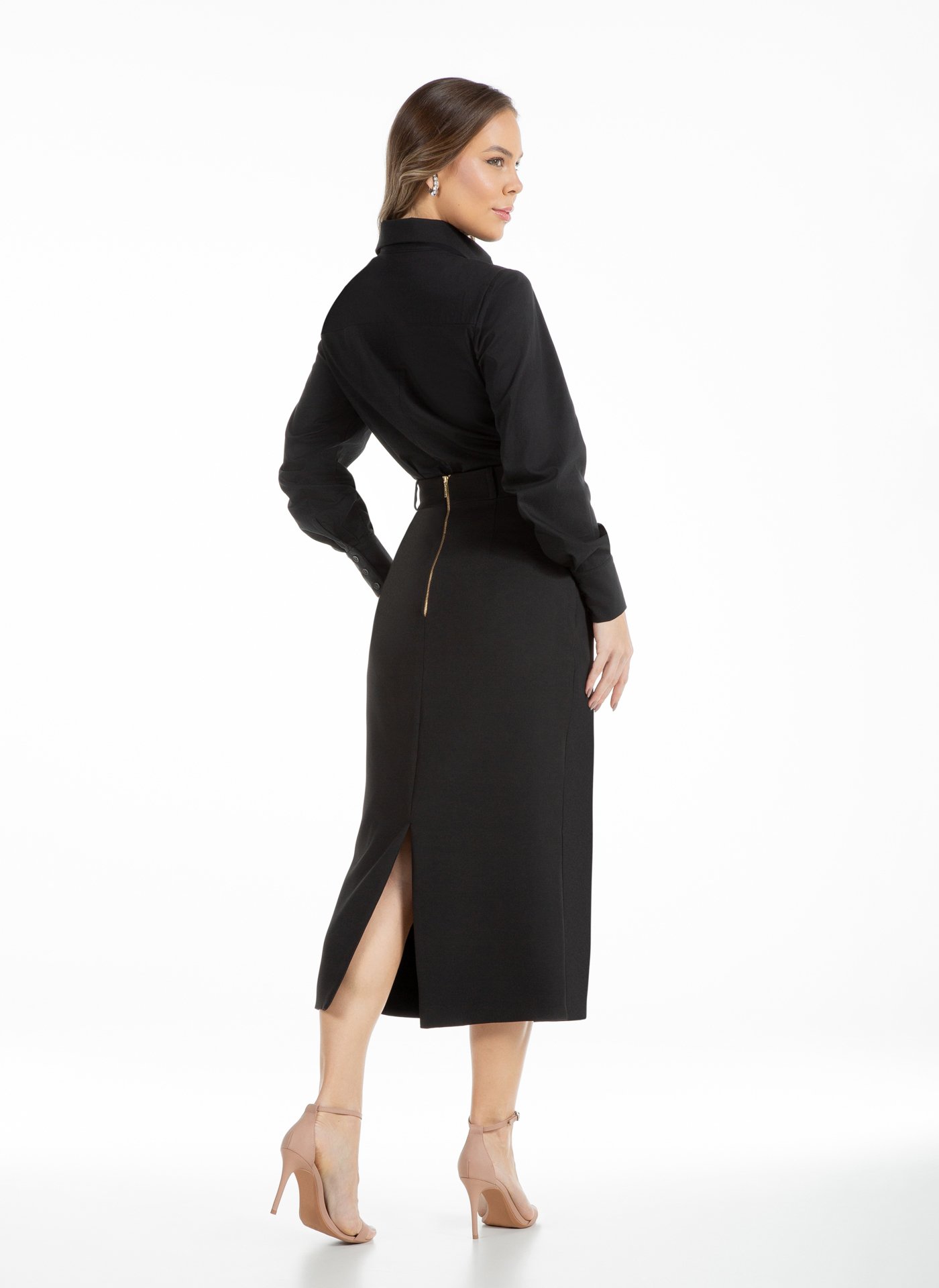 Saia em alfaiataria premium, tecido duplo. Cintura alta, justa e reta, cós estruturado, com comprimento abaixo dos joelhos, fechamento atrás com zíper dourado, fenda atrás. Peça sofisticada para composições com tops, camisas e blazers, design limpo e refinado.