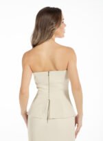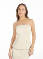 Top sem alças, em alfaiataria premium, confeccionada em tecido duplo e sustentação com barbatanas. Seu design clássico se diferencia pelo recorte estruturado que revela os ombros com fechamento em zíper nas costas. Uma lapela em cada lateral e cintura destacada deixam a peça com uma silhueta elegante e combina perfeitamente com saias e calças.